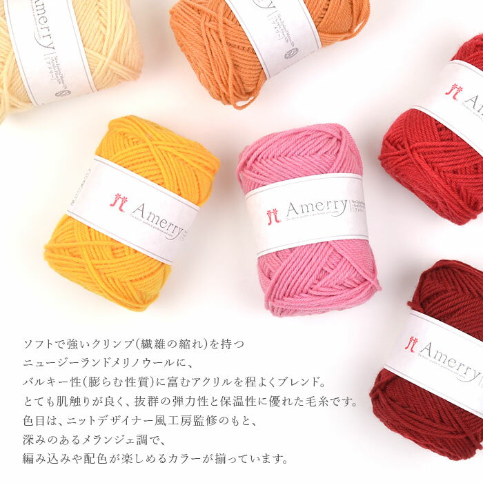 メーカー希望小売価格はメーカーカタログに基づいて掲載していますブランド名 Hamanaka(ハマナカ) 商品名 AMERRY(アメリー) 太さ 並太 仕立 40g玉巻(約110m) 素材 ウール70%(ニュージーランドメリノ) アクリル30% 使用針 棒針6号〜7号 かぎ針5/0号〜6/0号 ゲージ 棒針19〜20目27〜28段 かぎ針20〜21目9〜9.5段 標準使用量(メリヤス編み) ・婦人ベスト 5〜6玉 ・婦人セーター 8〜9玉 ・婦人カーディガン 9〜10玉 ・紳士セーター 10〜11玉 ・子供セーター(5〜6才) 5玉 洗濯表示 商品説明 ソフトで強いクリンプ(繊維の縮れ)を持つニュージーランドメリノウールに、バルキー性(膨らむ性質)に富むアクリルを程よくブレンド。