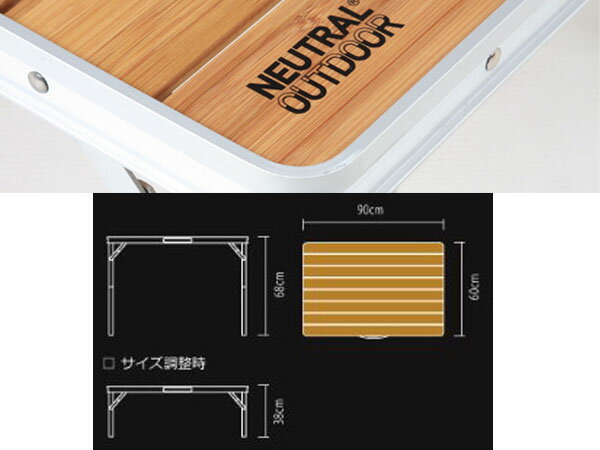 ・天板:竹材 ・メッシュハンガー:ポリエステル ・フレーム:アルミニウム 展開サイズ:天板サイズ 90x60cm 天板高さ 38cm/68cm(二段階切り替え) 収納サイズ:W90xH31xD8cm 重 量:5.2kg 付属品:メッシュハンガー NEUTRAL OUTDOORとは 2015年春よりスタートした新しいキャンピングギアブランドです。