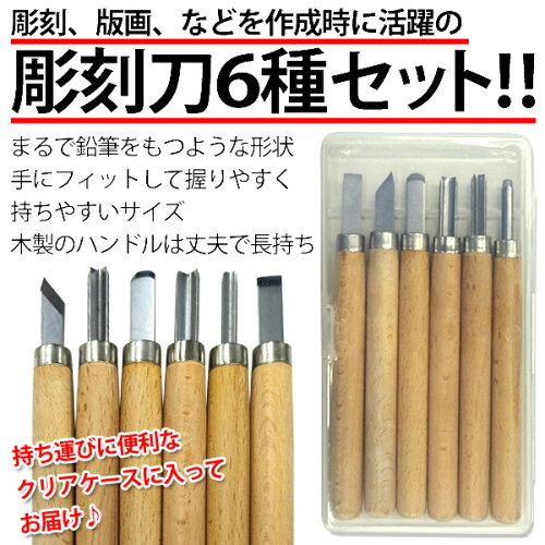 切れ味も良く長持ち! 彫刻刀6種セット 握りやすく使いやすい! 専用彫刻・DIY・アクセサリー作りなど マルチに使える工具 彫刻、版画、ストローアート・工作、アクセサリーなどを 作成時に活躍の彫刻刀6種セット! まるで鉛筆をもつような形状で手にフィット! 握りやすく持ちやすいサイズ 木製のハンドルは滑りにくく丈夫で長持ち ■小丸刀・丸刀 最も使いやすい彫刻刀 広い部分を彫り進むときに使う大小二種類の刀 線の太さや彫る広さに合わせて使い分ける ■切出刀 切り込みを入れるのに用いる刀 細部を加工するときに使いやすい はっきりとした輪郭や鋭い線の切れ込みを入れる ■三角刀 細い線や鋭い線を彫ることができる ■平丸刀 平刀の両角を丸く研いだもの 脇がむしれにくく、すくえば極浅丸のような彫り跡が表現できる ■平刀 平らに削れる 丸刀などの彫り跡を削るときによく使う 持ち運びに便利なクリアケースに入ってお届け♪